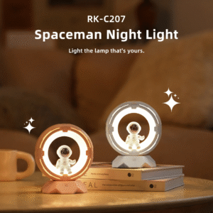 - It features a charming spaceman figure within a circular light ring.